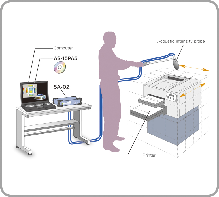 通過測量表示在某個方向上流動的聲能的聲強,可以在不使用諸如消聲室的特殊設施的情況下定位和可視化噪聲源。通過將聲強探頭SI-31I連接到多通道分析處理器SA-02系列,并使用聲強測量軟件AS-15PA5完成測量。使用AS-15PA5,可以繪制輪廓圖和網格圖,從而可以顯示對象的響度。 此外,矢量圖可以使聲音流方向可視化。使用強度探頭SI-33I在三個軸向上同時測量,可以一次測量三個方向上的聲強。