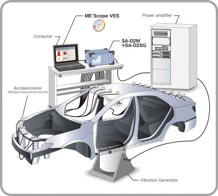 最簡單的測量系統可以通過四通道分析儀 SA-02A4, 脈沖錘, 加速度傳感器,和模態分析軟件 ME'Scope VES 構成。