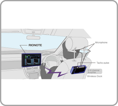 在圖中展示的測量系統里,兩個麥克風安裝在駕駛員的耳部位置,用于分析加速期間的噪聲特征。轉速脈沖輸入也可用在此設置中。為了減少布線工作,麥克風信號可由無線發射器 SA-A1WD 發送到 SA-A1 中進行處理。無線功能使得 SA-A1 可放置在車內或車外。 SA-A1主機最多能連接四個 SA-A1WD 發射器,可以對應多達16通道(4通道x 4個單元)的噪聲振動測量分析。配置清單
