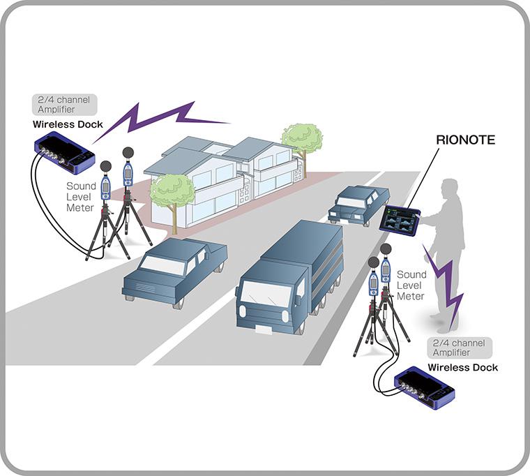 SA-A1主機最多能連接四個 SA-A1WD 發射器,可以對應多達16通道(4通道x 4個單元)的噪聲測量和分析。(對于1/3倍頻程分析,最大為3通道×4個單元=12個通道。)圖中展示了用于噪聲測量的實例,通過連接加速度傳感器也可以相同的方式進行多通道振動測量。配置清單