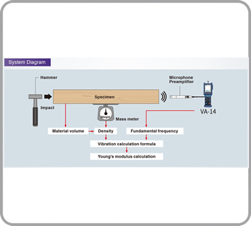 通過 VA-14 振動分析儀和麥克風(安裝 VX-14S 擴展程序)測量敲擊木材的聲音,可根據聲頻、木材體積和密度計算楊氏模量。